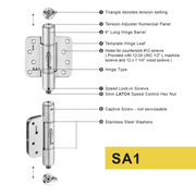 Product SKU K51M-400Z-B4-5/8R Hinge Type Full Mortise, 4 Inch x 4 Inch Hinge Material Stainless Steel Door Weight Up to 330lbs Approx Door Size 1150mm W x 2200mm H (4ft x 8ft) Door Thickness 1 3/8" Self-closing o Fluid Motion o Hold-open x Fixing Method Screw-On, only spot weld AFTER speed adjustment Color/Finish Satin Brushed,Black,Gold,ORB Combination/Quantity DS.HA.SA.SA1,3 Pack Hinge Gauge 0.130" -